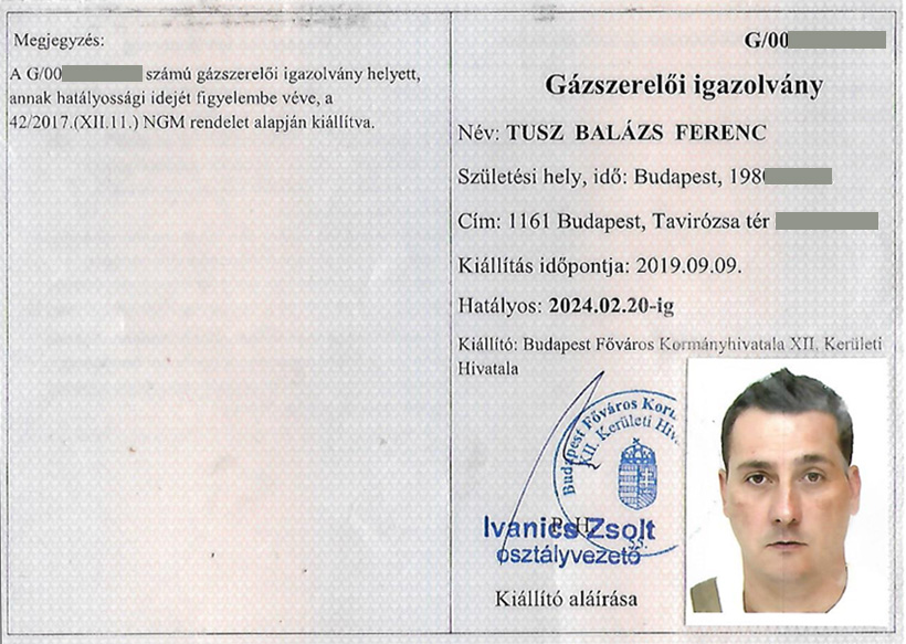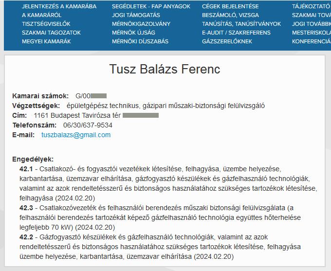 Ennek két módja is van. Ügyfélként mindig kérje el a gázigazolványt, aminek a hátoldalán ott szerepel az, hogy mire jogosult a szerelő. A másik lehetőség, hogy a mérnöki kamarara oldalán (mmk.hu) le tud bárkit ellenőrizni név alapján. Az egyik kép az érvényes gázigazolványt mutatja, a másik pedig az online nyilvántartásban szereplő adatokra példa.